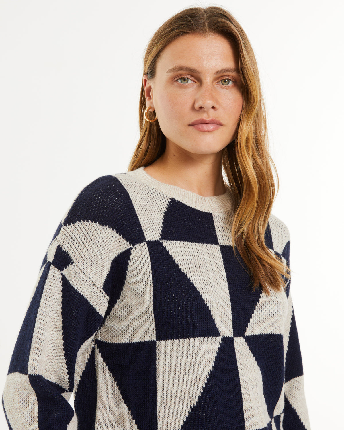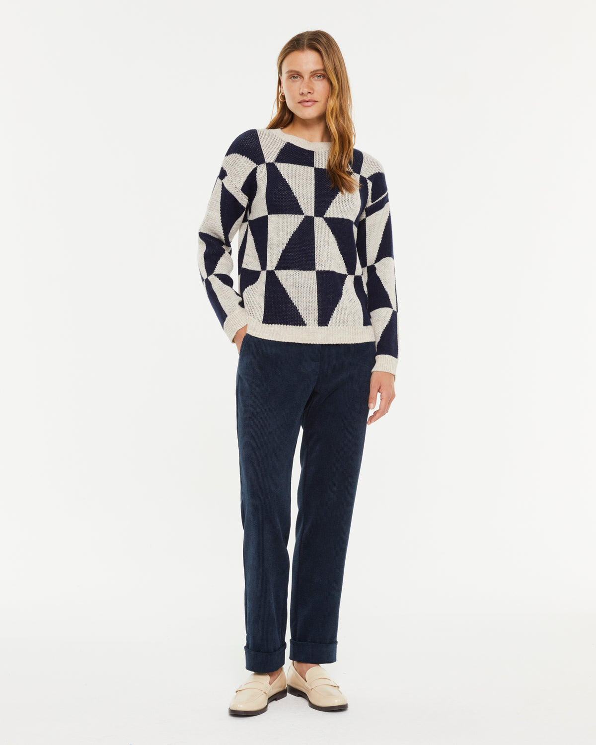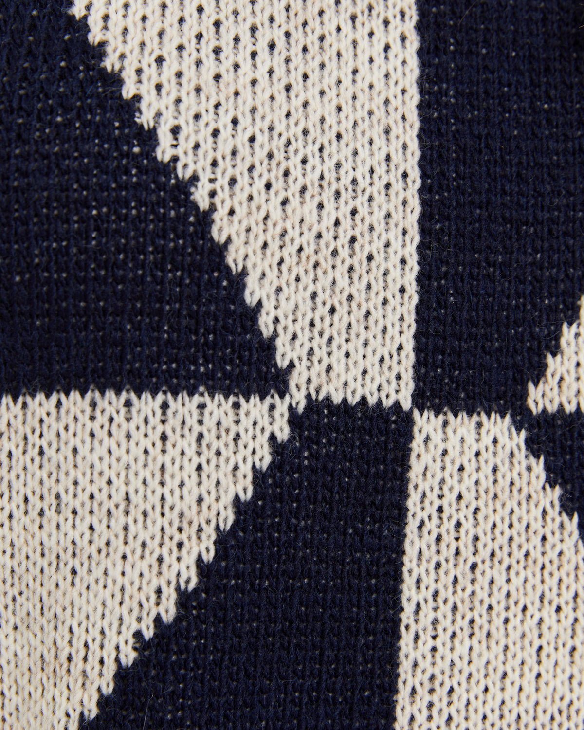 Jersey jaquard de rombos bicolor de manga larga y cuello redondo. Confección de canalé en cuello, puños y bajos. Regular fit.