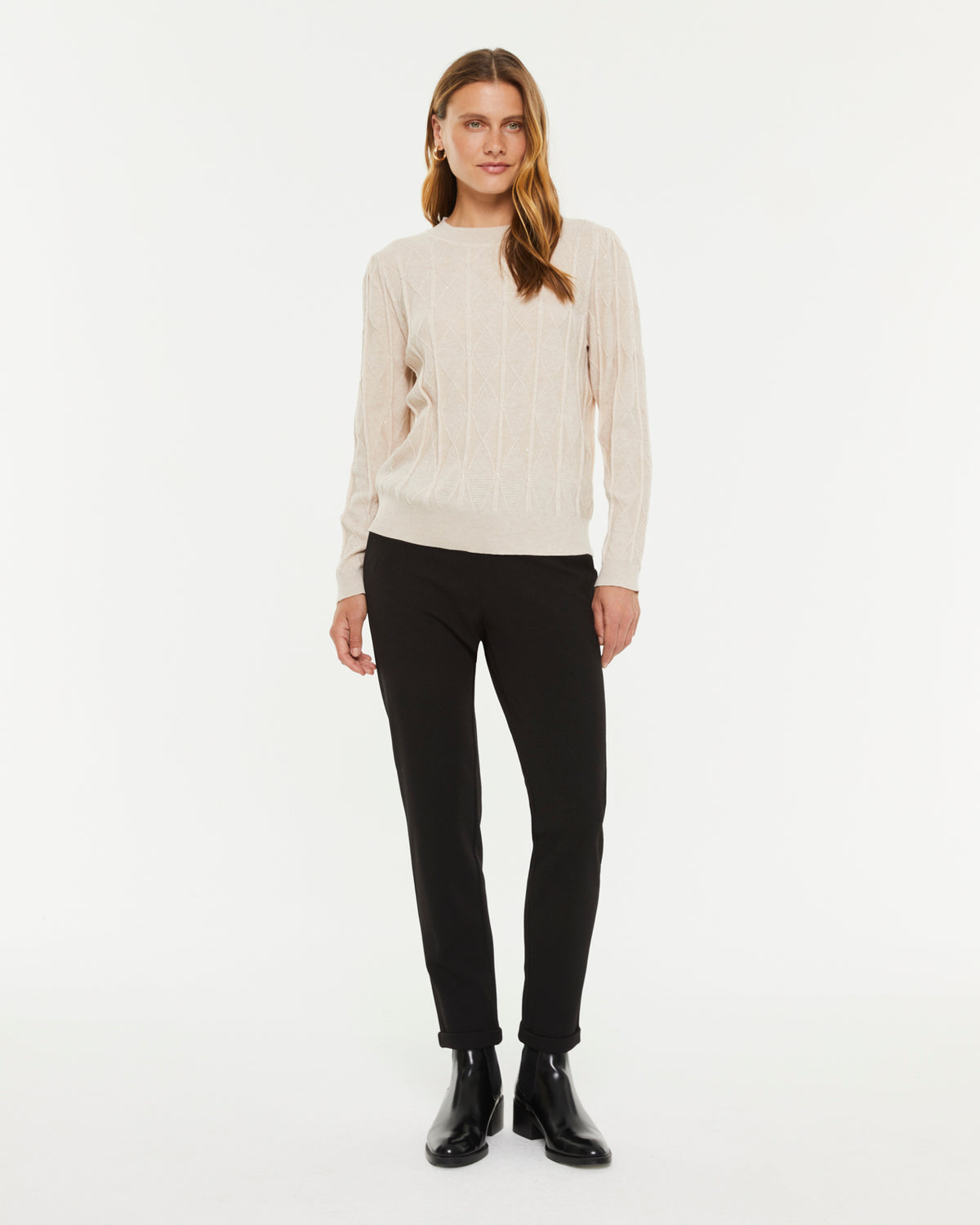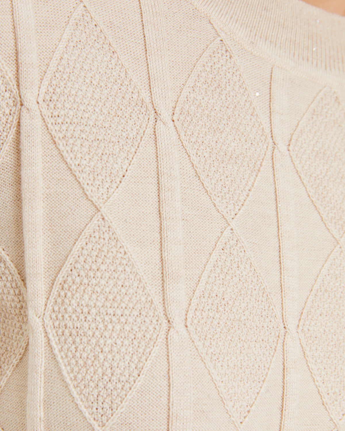 Jersey de punto fantasía con micro lentejuelas manga larga y cuello redondo. Confección de canalé en cuello, puños y bajos. Un jersey muy versátil para llevar en cualquier ocasión. Regular fit.