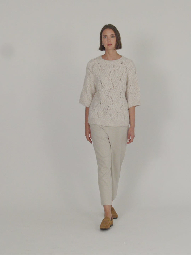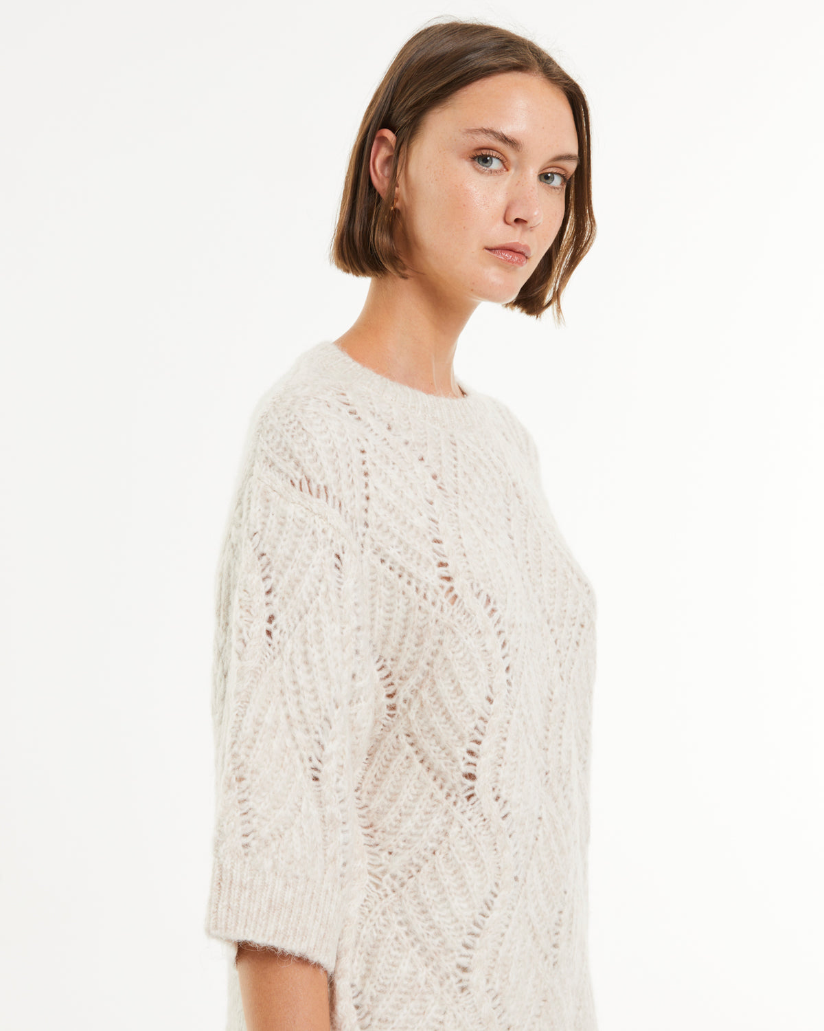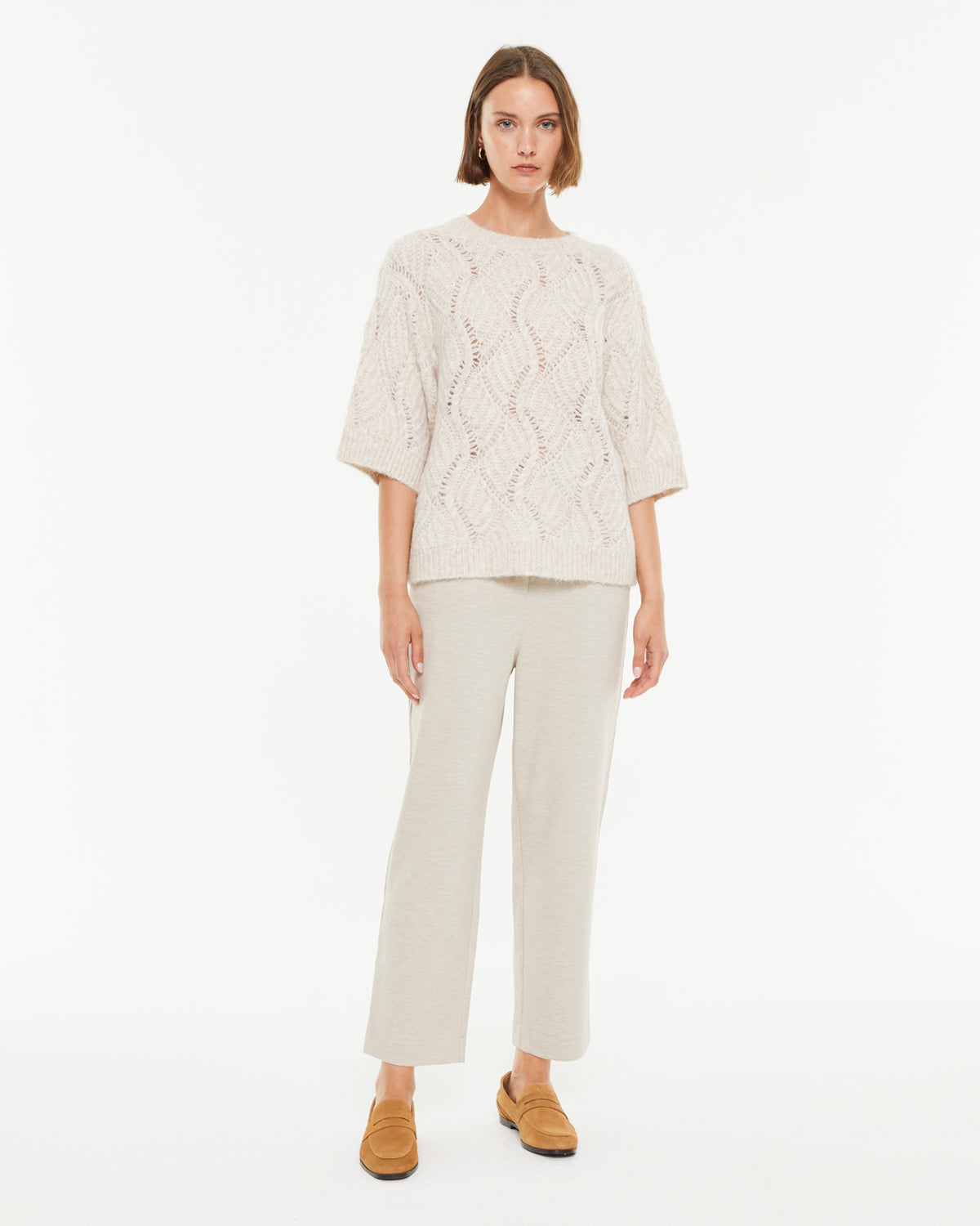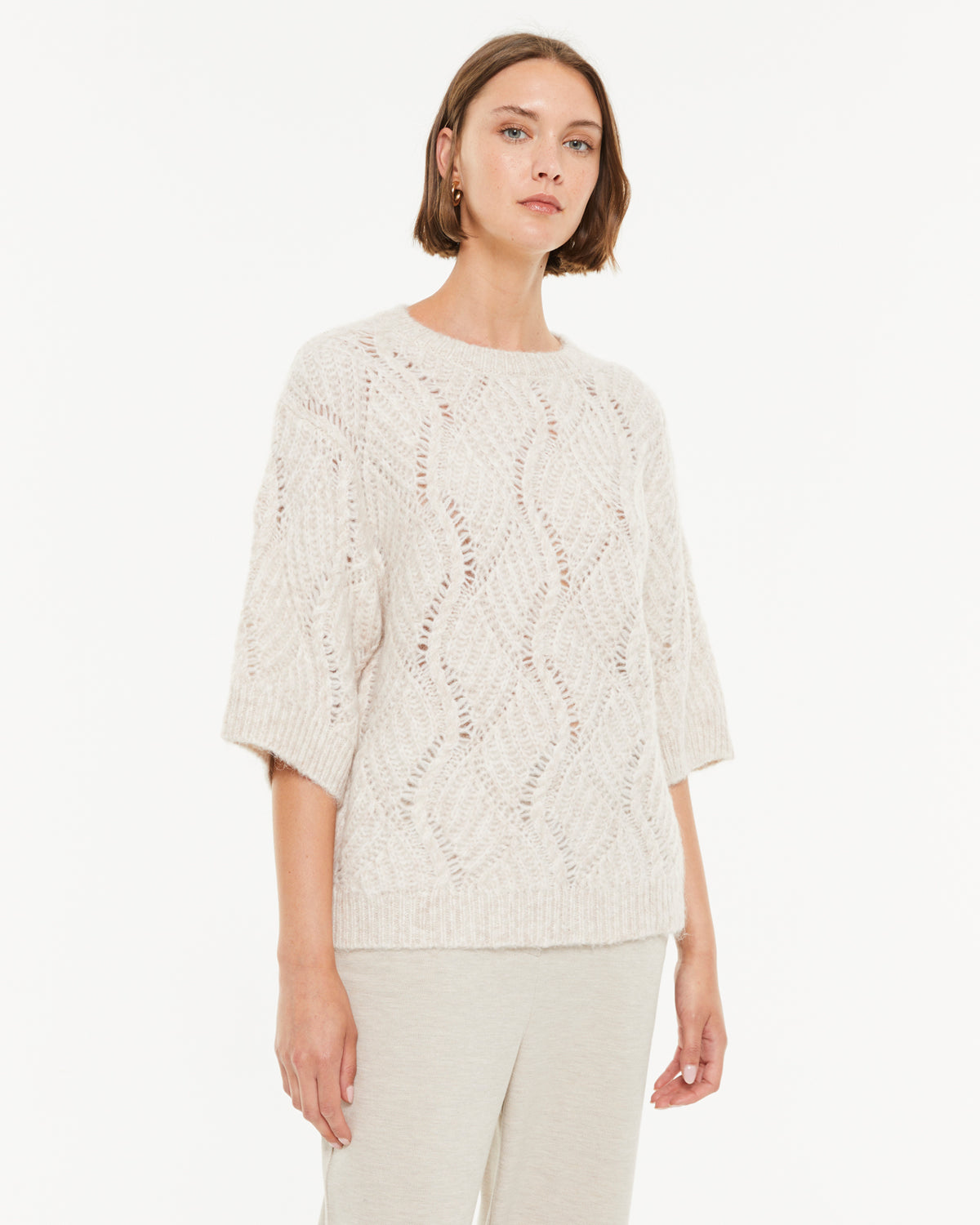 Jersey de punto fantasía calado, cuello redondo y manga a codo. Regular fit.