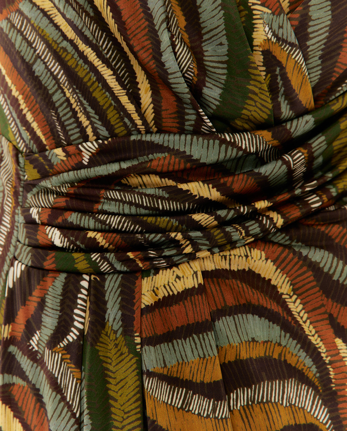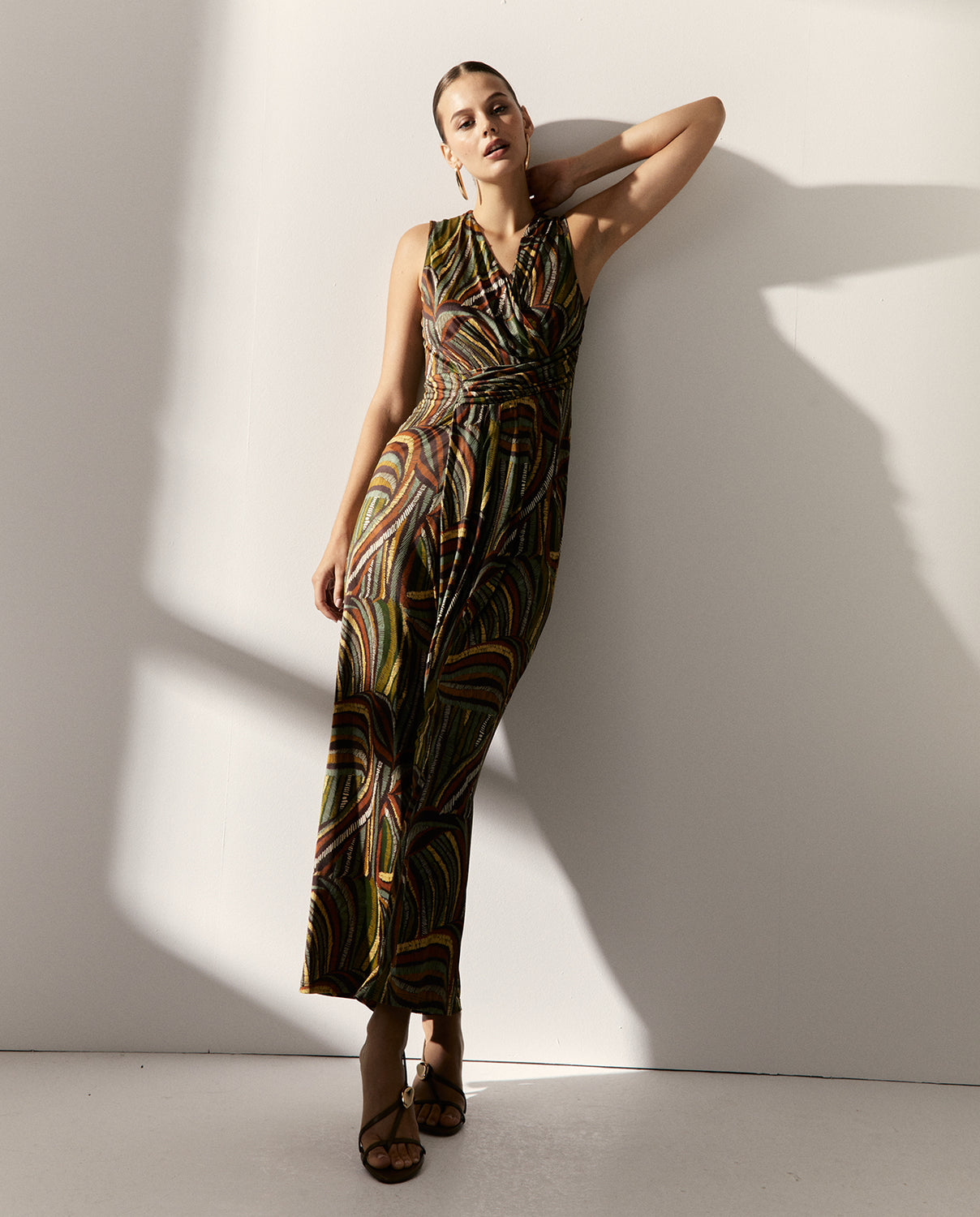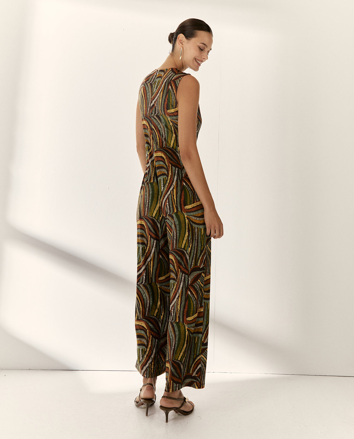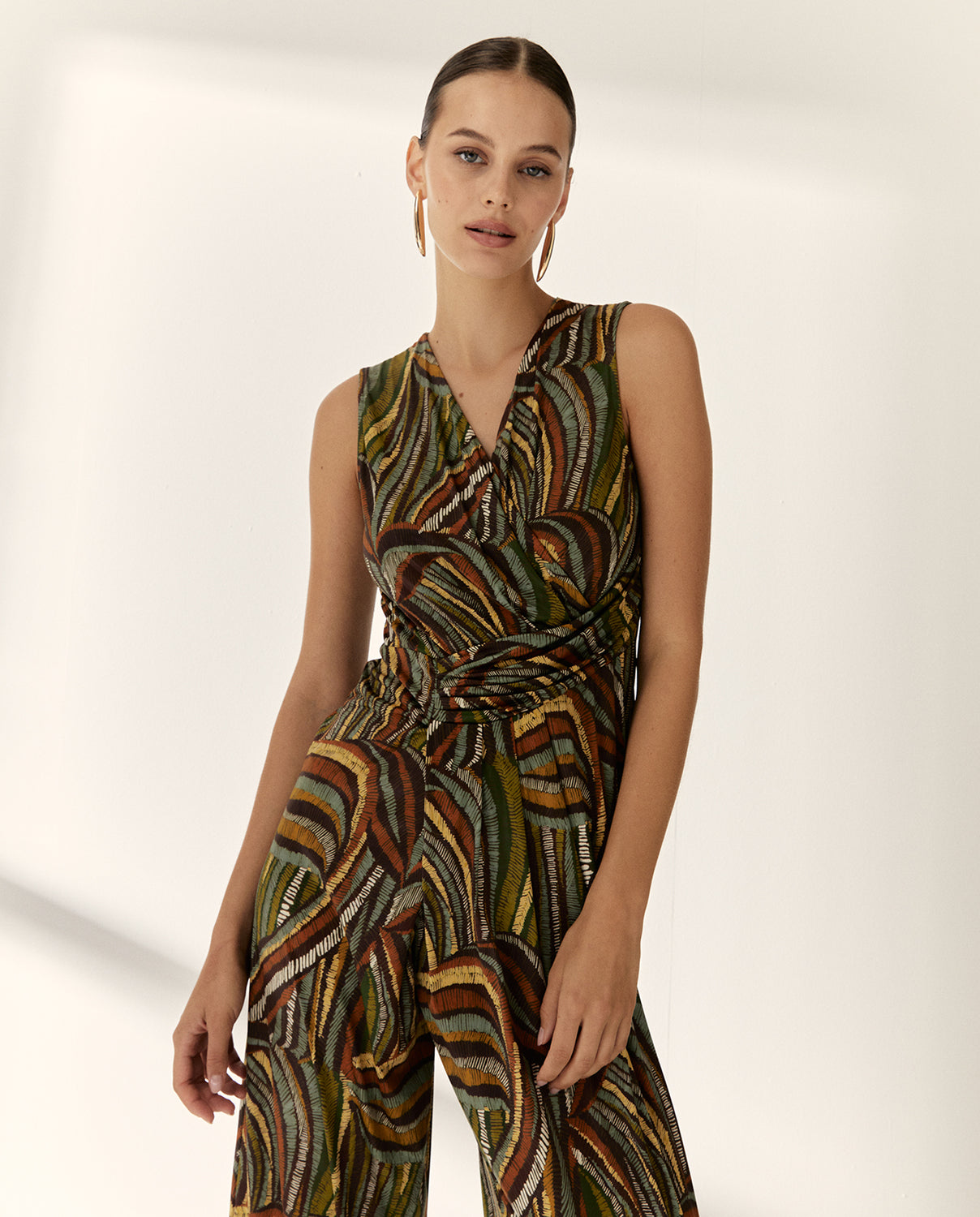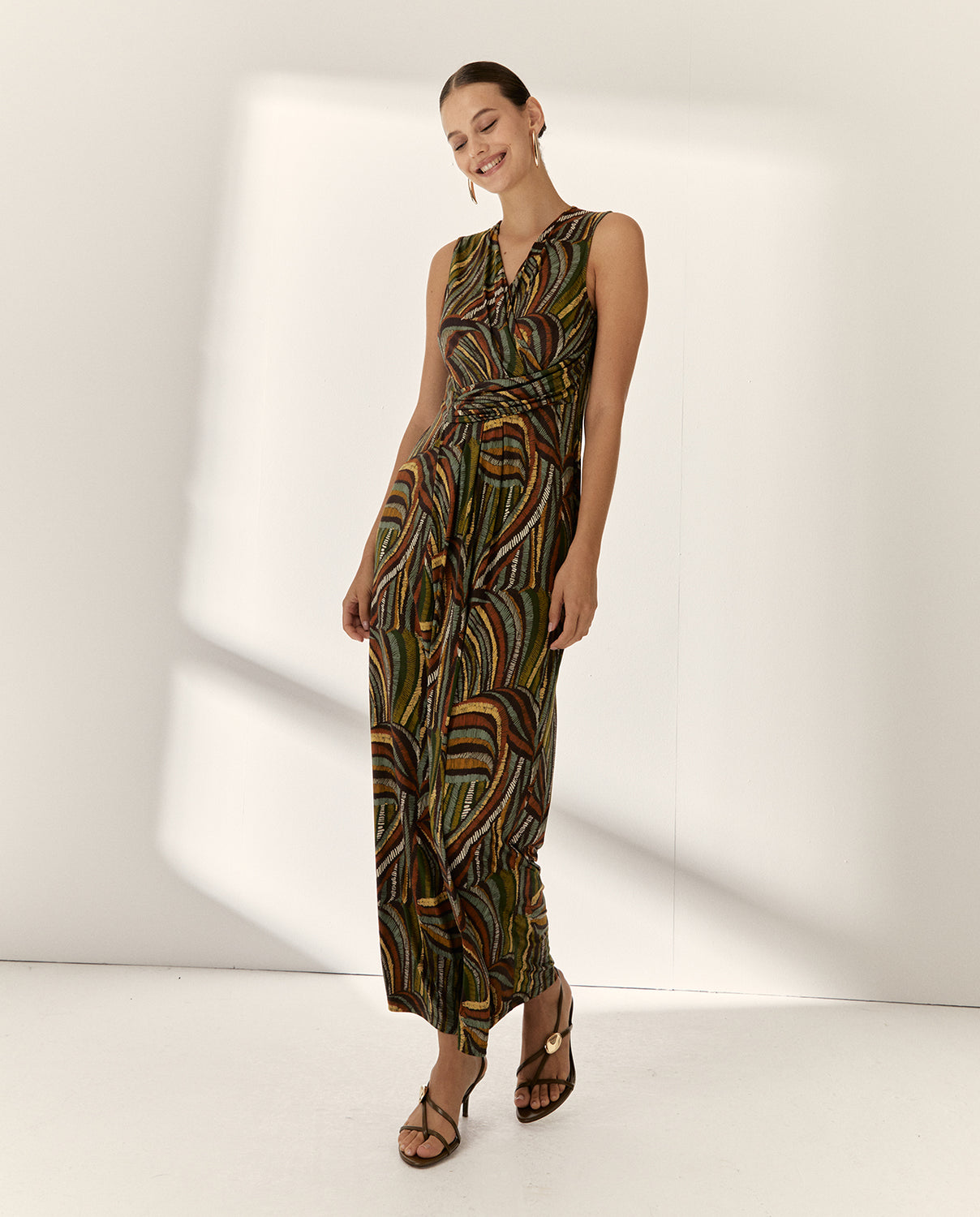 Elegancia y comodidad en una sola pieza. Este mono estampado de punto combina un escote cruzado súper favorecedor, con un fajín drapeado cosido en un lateral que realza la silueta. Cierre centro espalda con cremallera invisible.