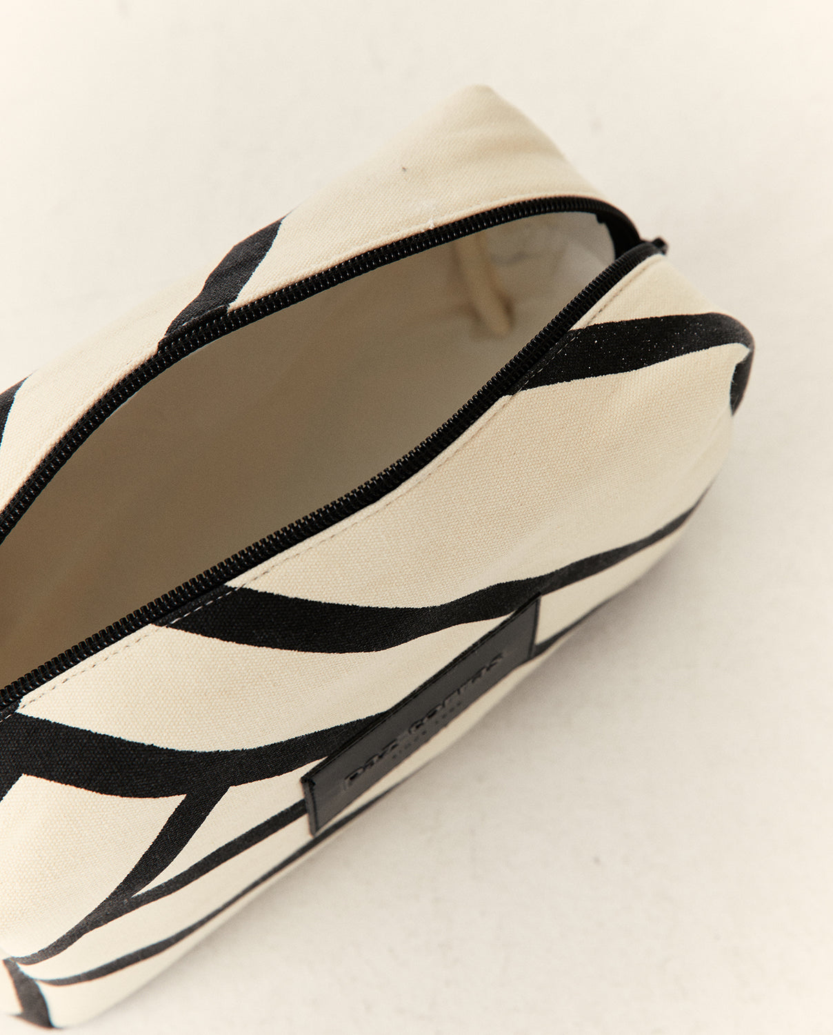 Neceser mediano de Paz Torras, estampado geométrico. Cierre con cremallera. Etiqueta de marca en polipiel negra.