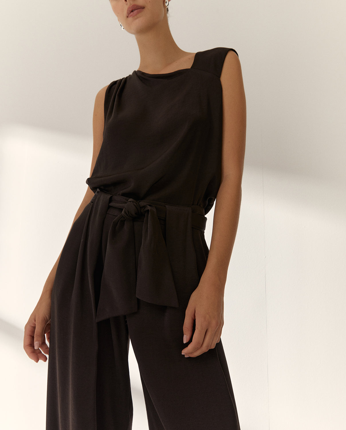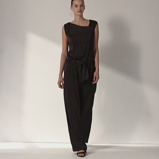 Pantalón ancho satinado con palas que llegan hasta la cintura, aportando un efecto estructurado y estilizado. Cierre frontal con botón y cremallera, incluye un cinturón tipo lazada que realza la cintura y aporta un toque sofisticado.