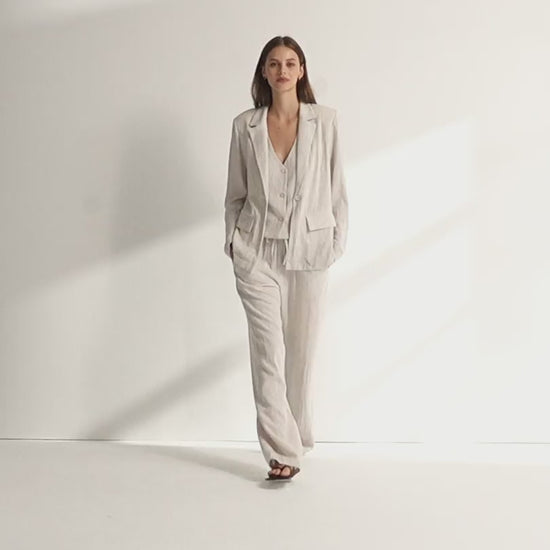Pantalón recto estampado mil rayas. Cintura con goma elástica y tira ajustable para un ajuste cómodo. Incluye bolsillos laterales, convirtiéndole en una prenda práctica, actual y muy favorecedora. Puedes encontrar su blazer y chaleco a conjunto.