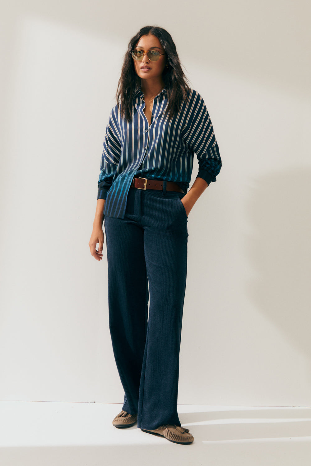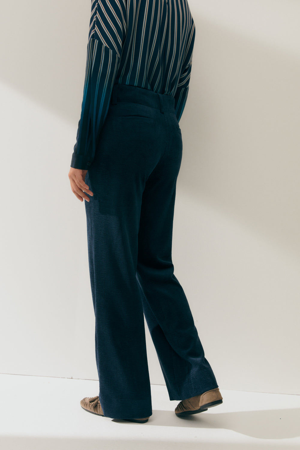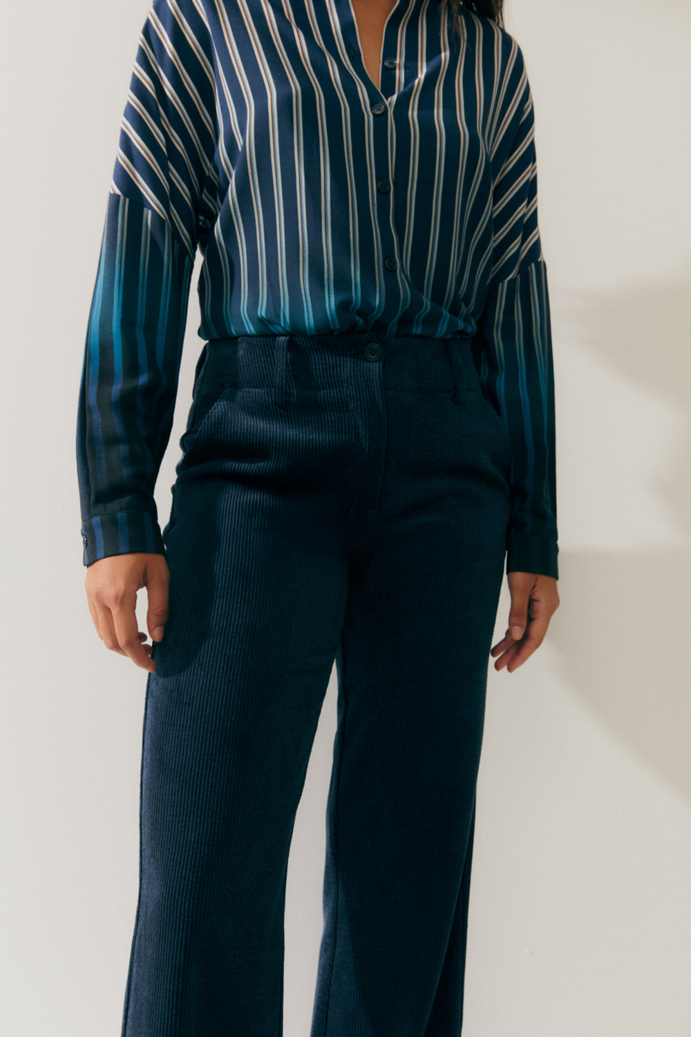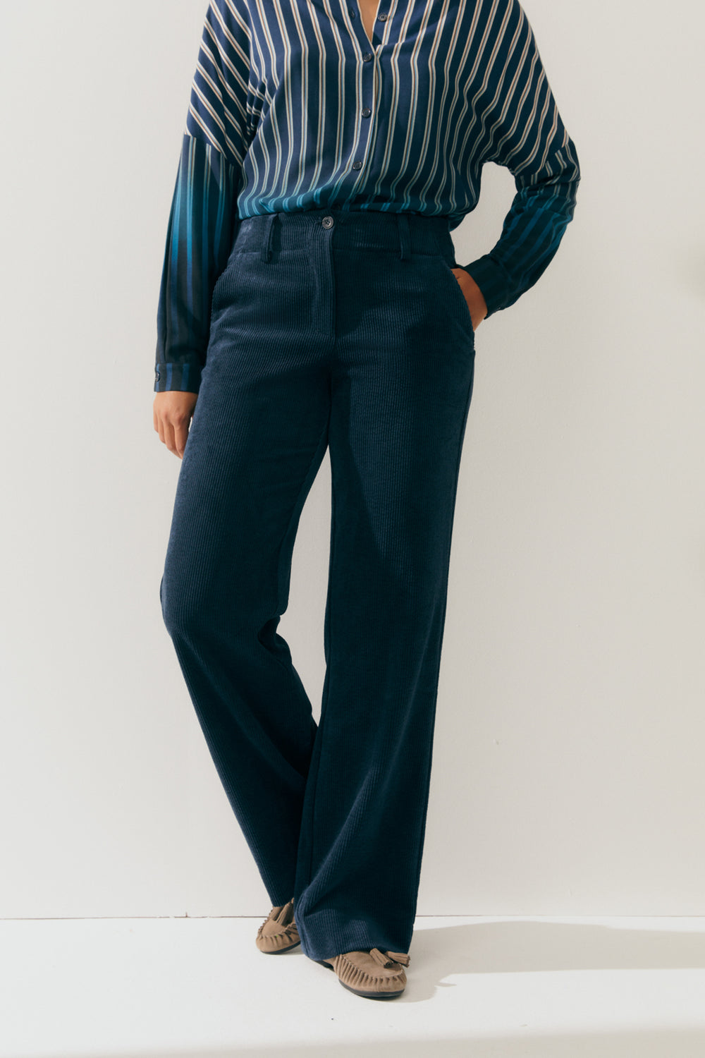 Pantalón recto de pana vuelta en el bajo. Bolsillos laterales en el delantero. Cierre con crermallera y botón. Goma elástica en cintura trasera para mayor comodidad.