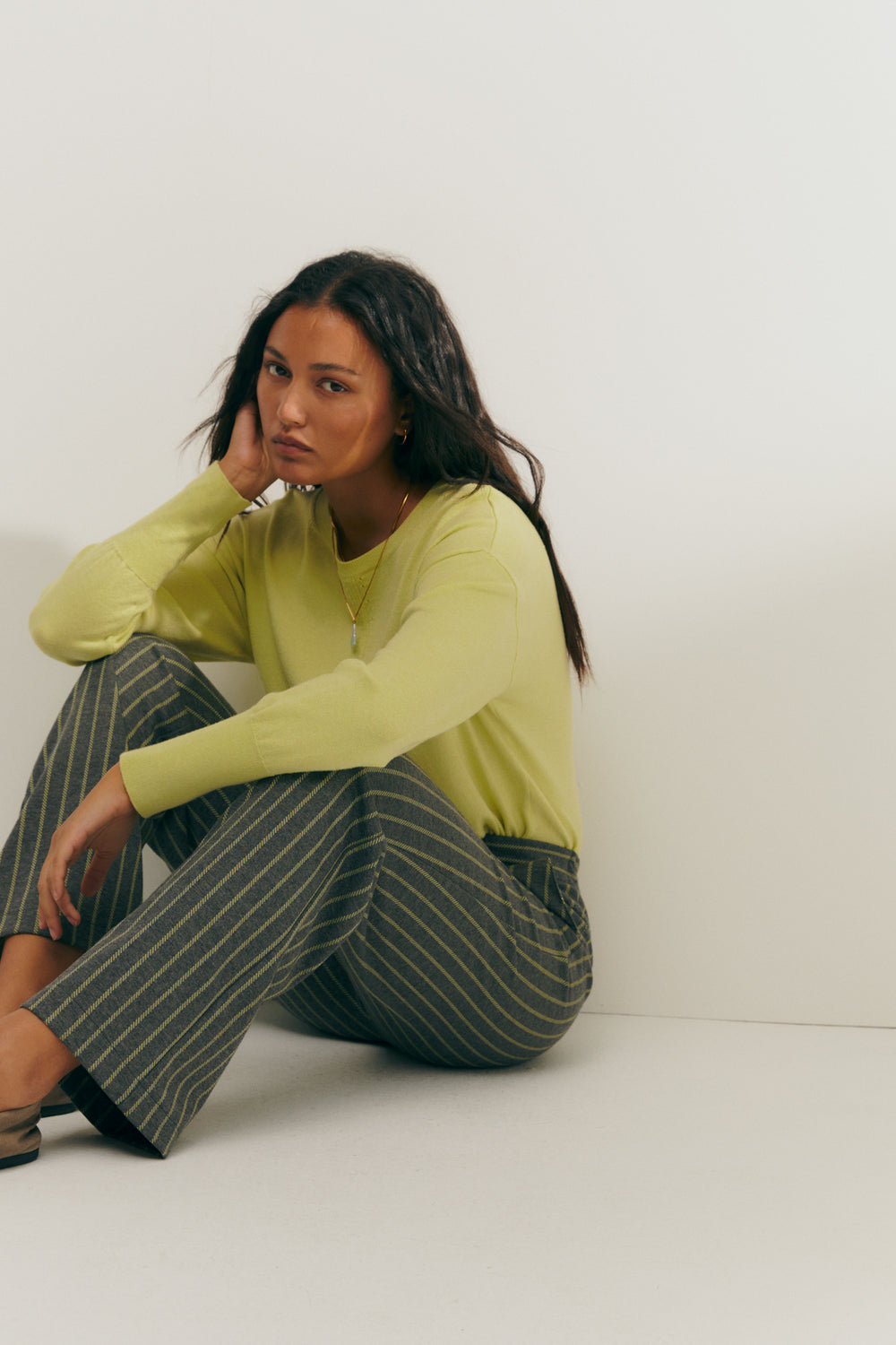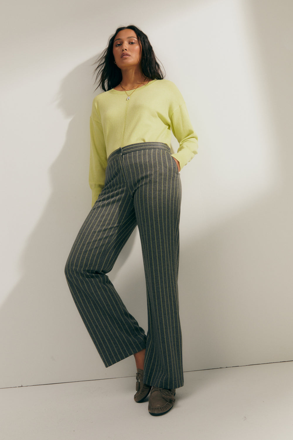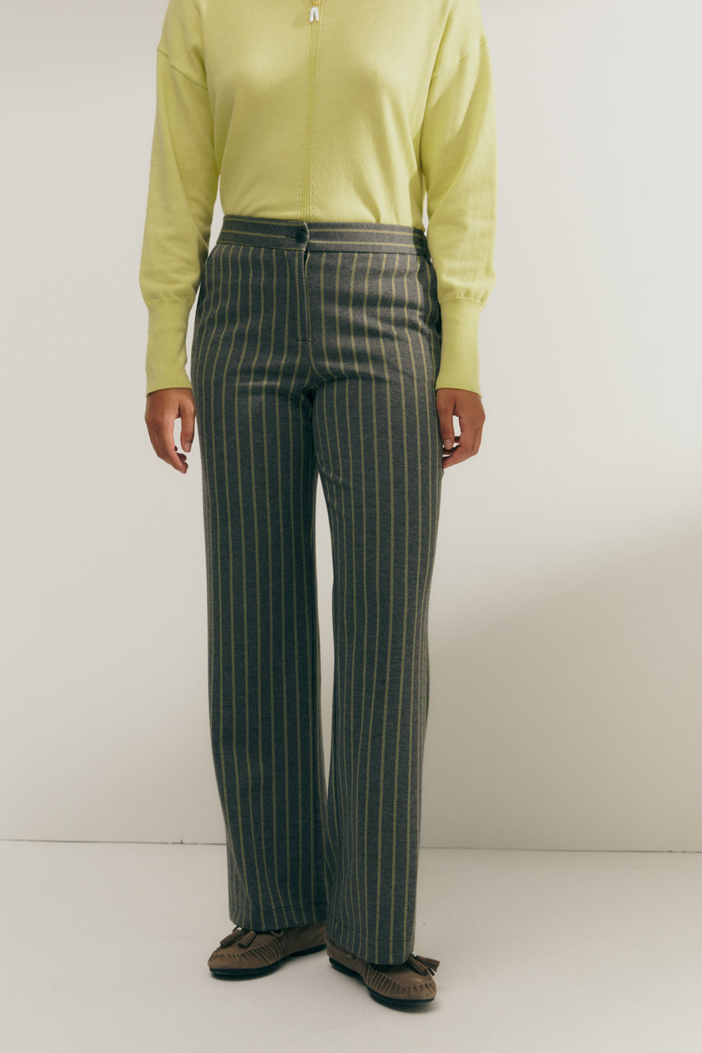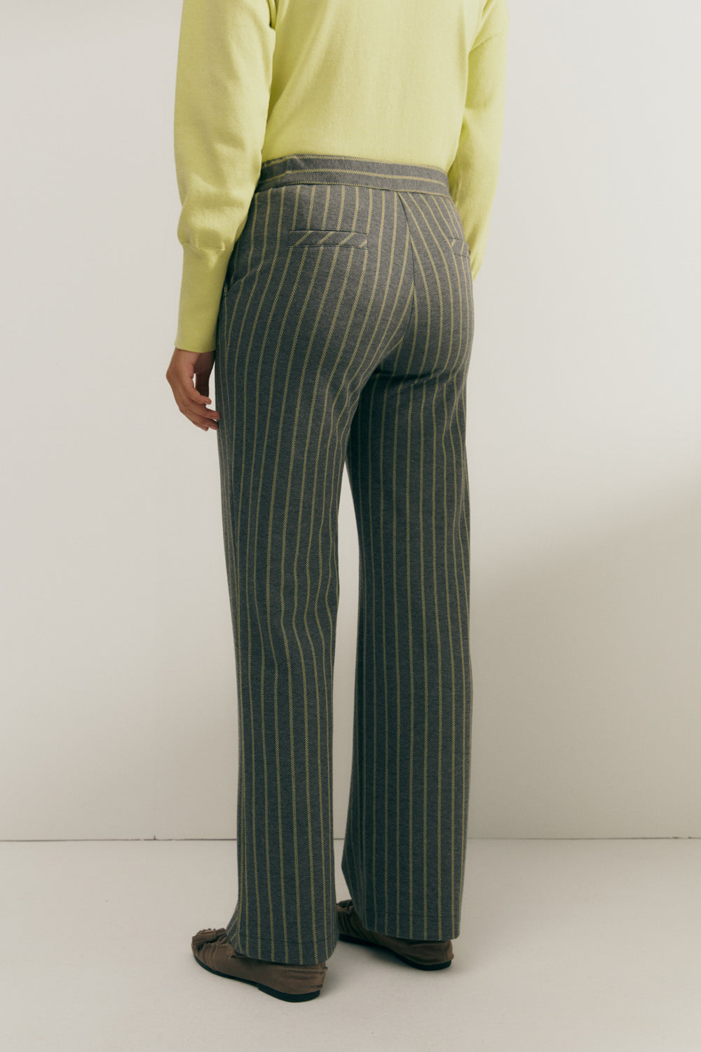 Pantalón recto en punto estampado de raya diplomática. Bolsillos laterales. Cierre con cremallera y botón. Goma elástica en el trasero. Puedes combinarlo con su blazer a juego para conseguir un traje de dos piezas.