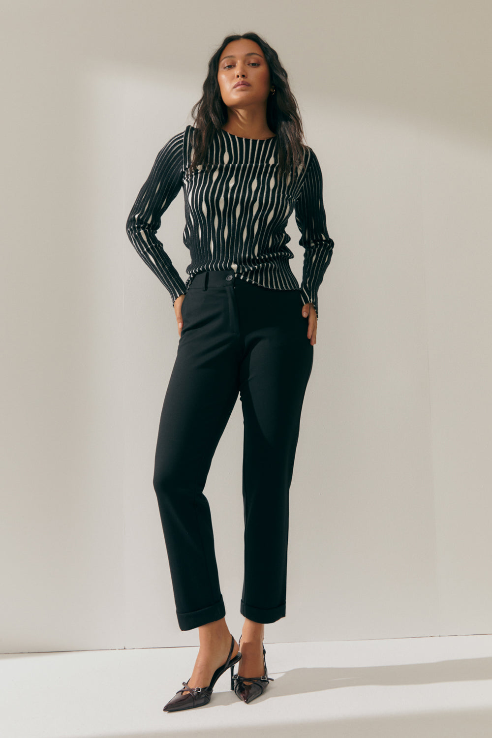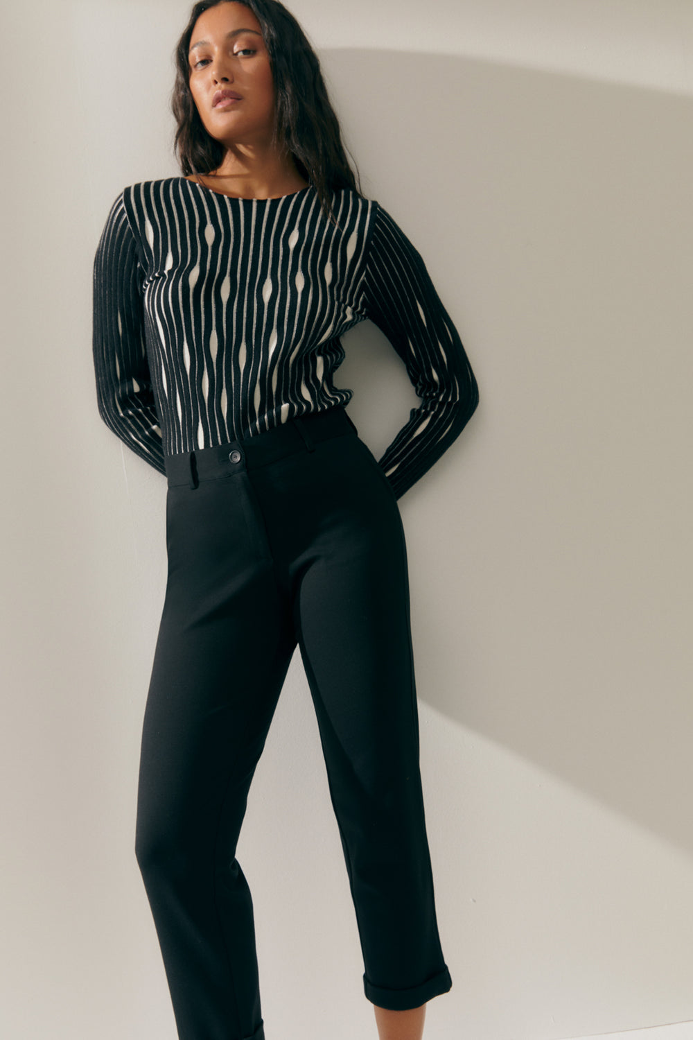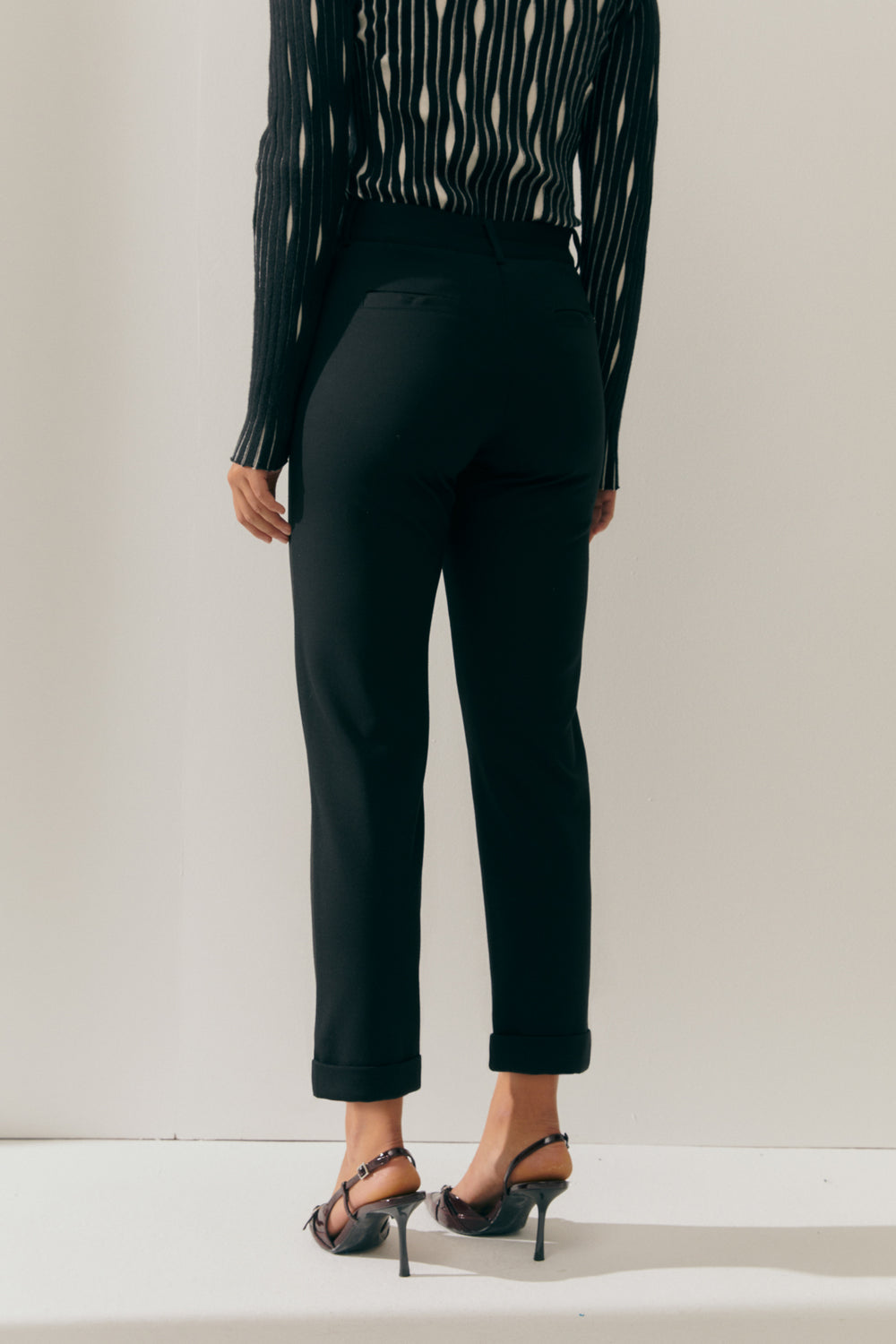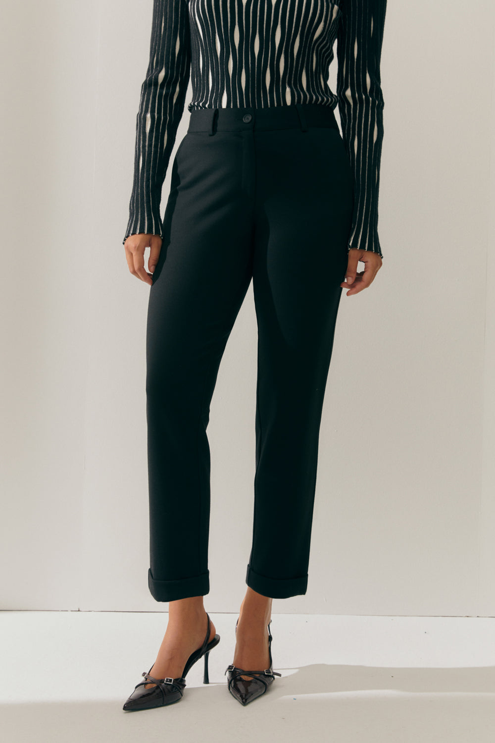 Pantalón recto de punto roma con vuelta en el bajo. Bolsillos laterales en el delantero y de vivo en el trasero. Cintura elástica en el trasero para mayor comodidad. Cierre con cremallera y botón.