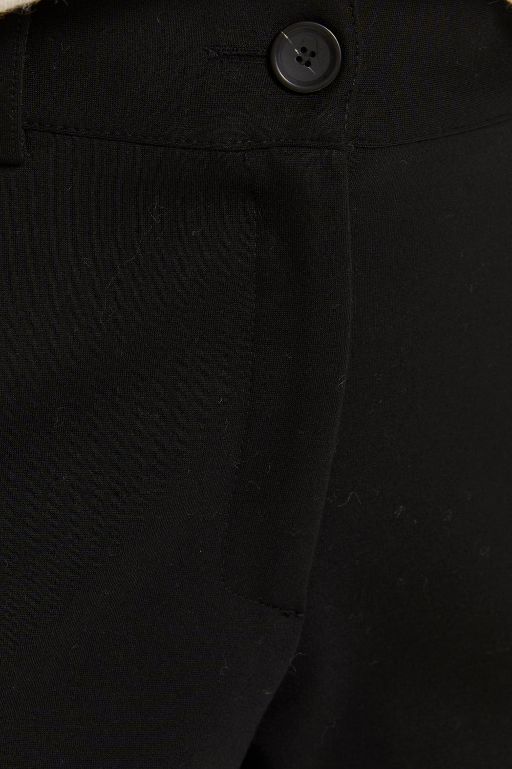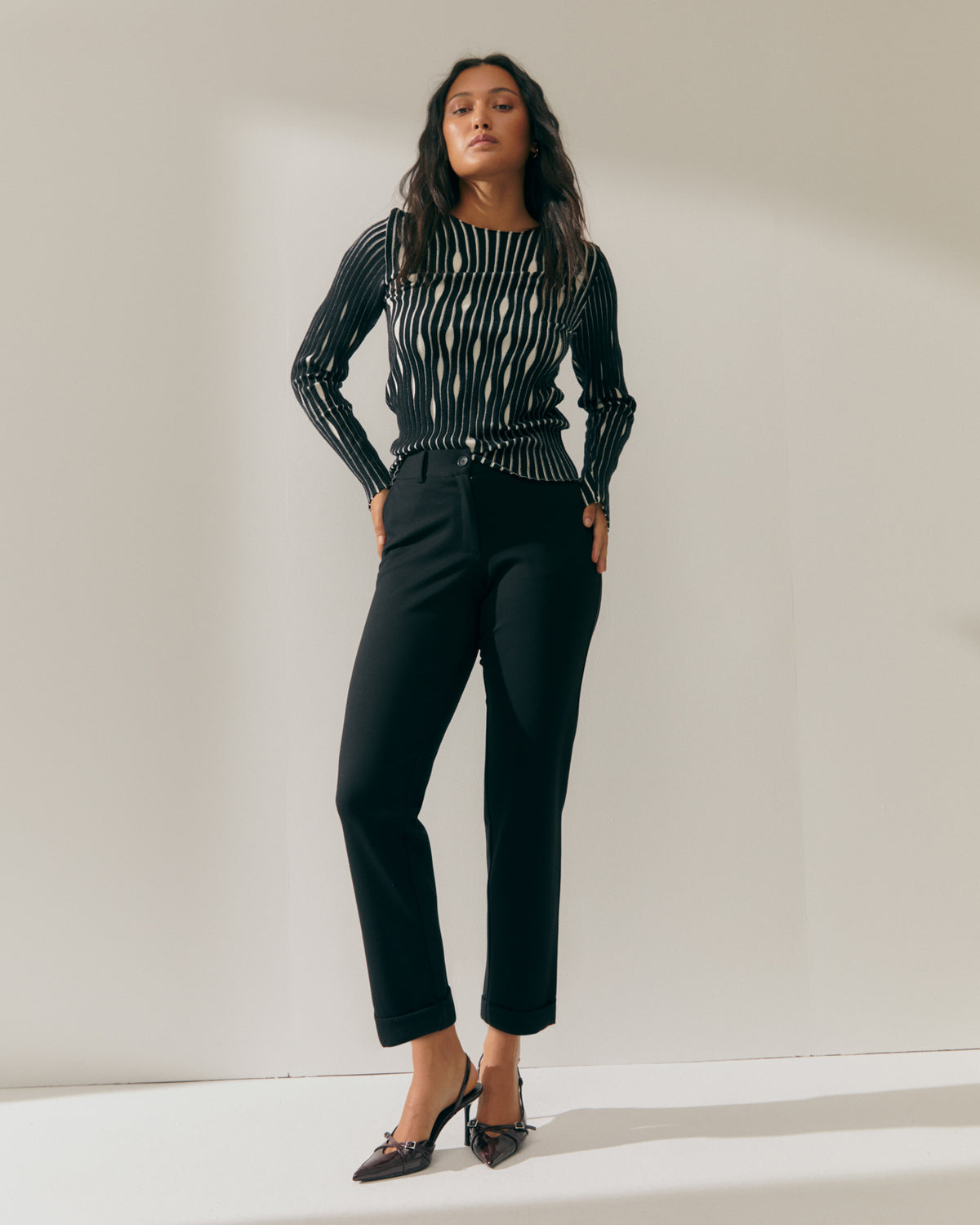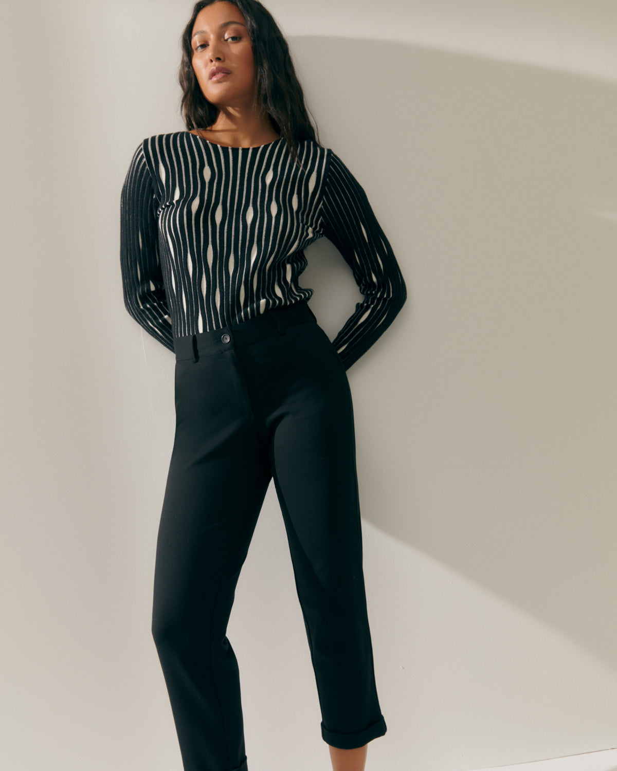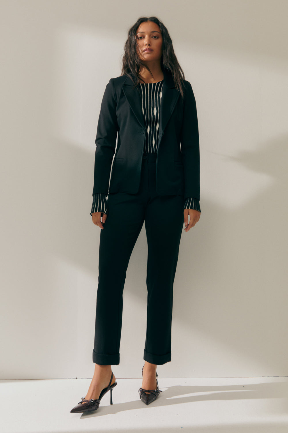 Pantalón recto de punto roma con vuelta en el bajo. Bolsillos laterales en el delantero y de vivo en el trasero. Cintura elástica en el trasero para mayor comodidad. Cierre con cremallera y botón.