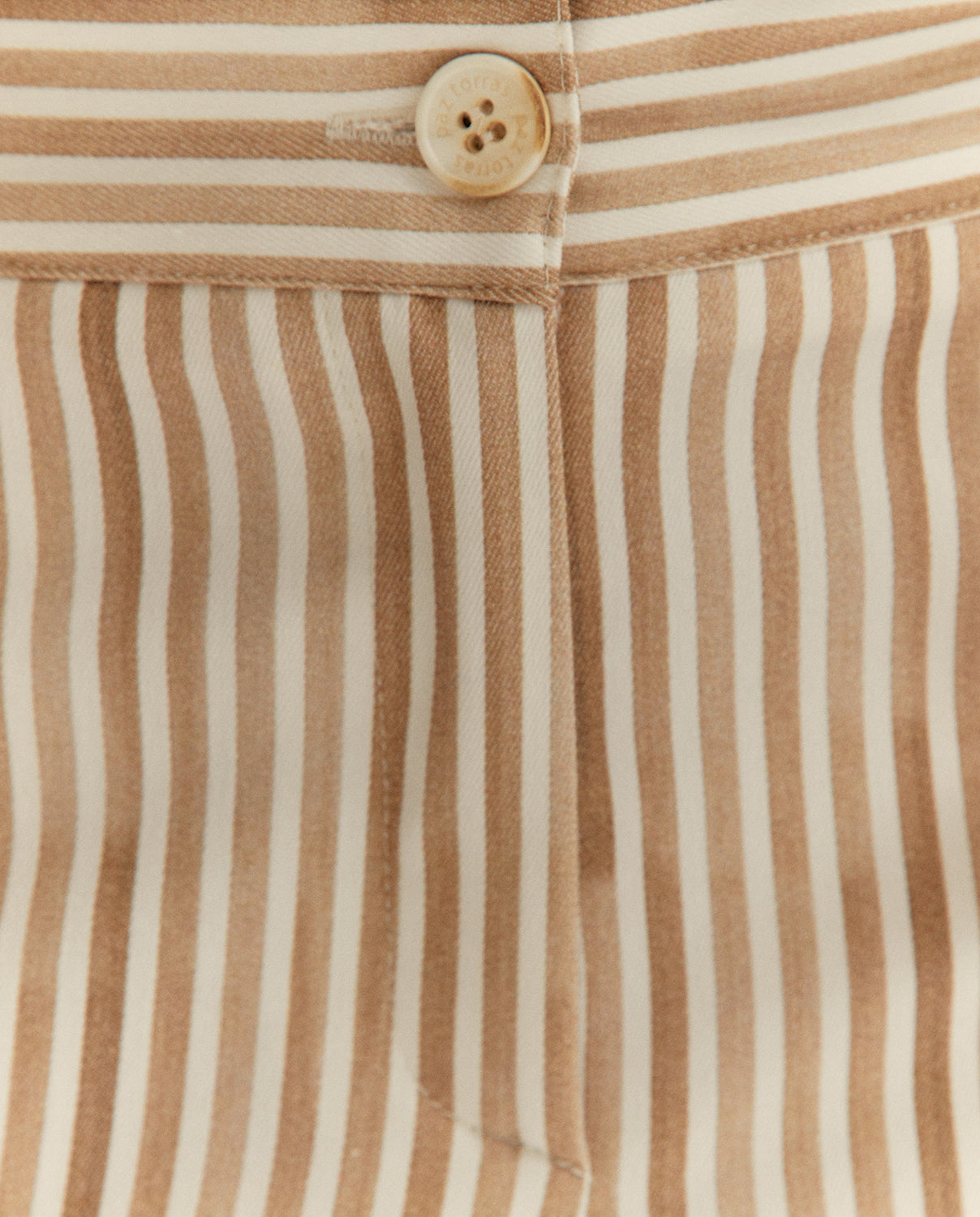 Pantalón estampado rayas, con puño en el bajo colocado en posición horizontal, que aporta un contraste visual moderno. Cintura con goma elástica en trasero. Cierre frontal con botón y cremallera. Incluye bolsillos delanteros y plastón en el trasero.