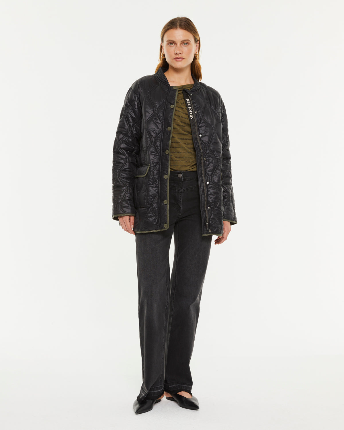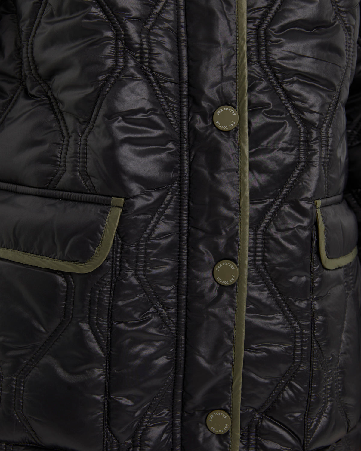 Parka acolchado sandwich con bolsillos plastrón, cuello tipo bomber y bajos redondeados. Detalle de vivos a contraste. Cierre con cremallera y botones a presión. Regular fit.