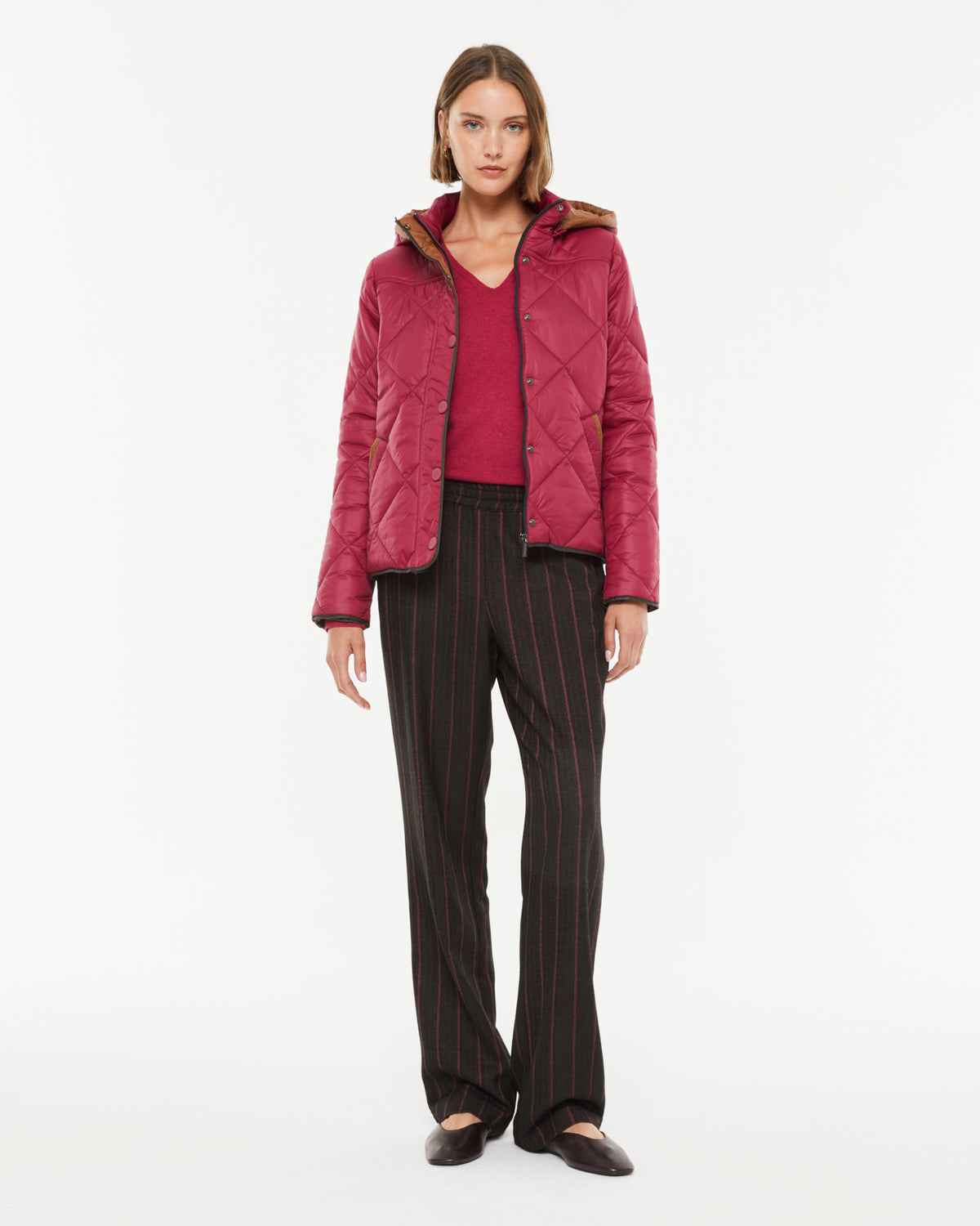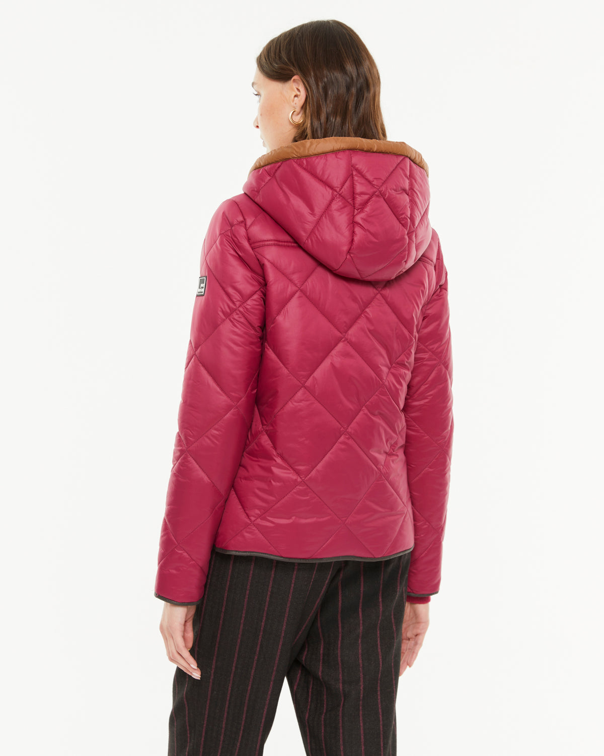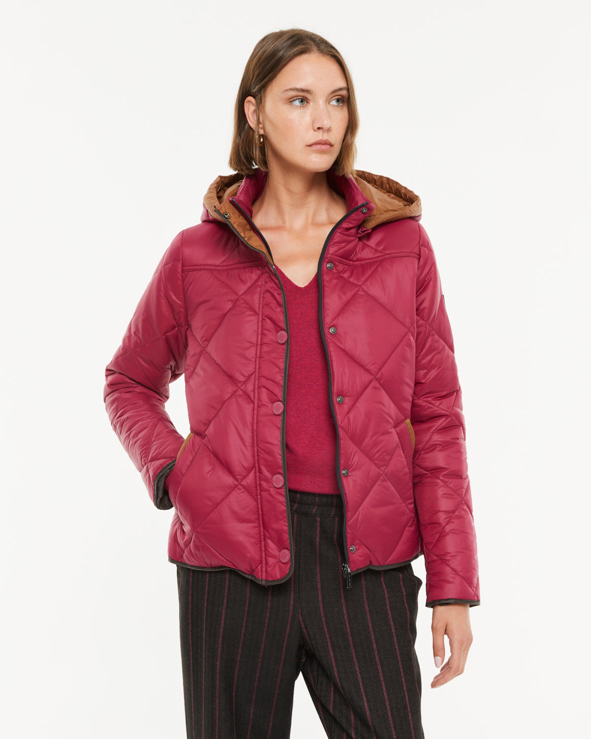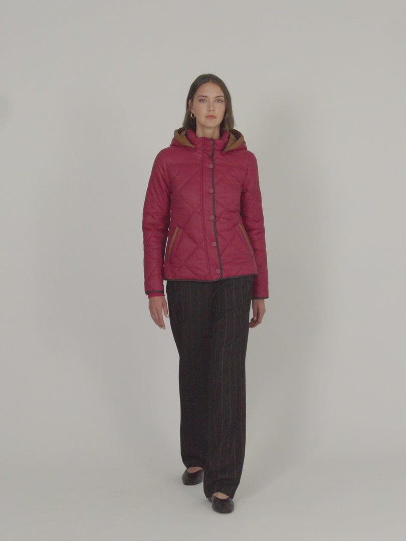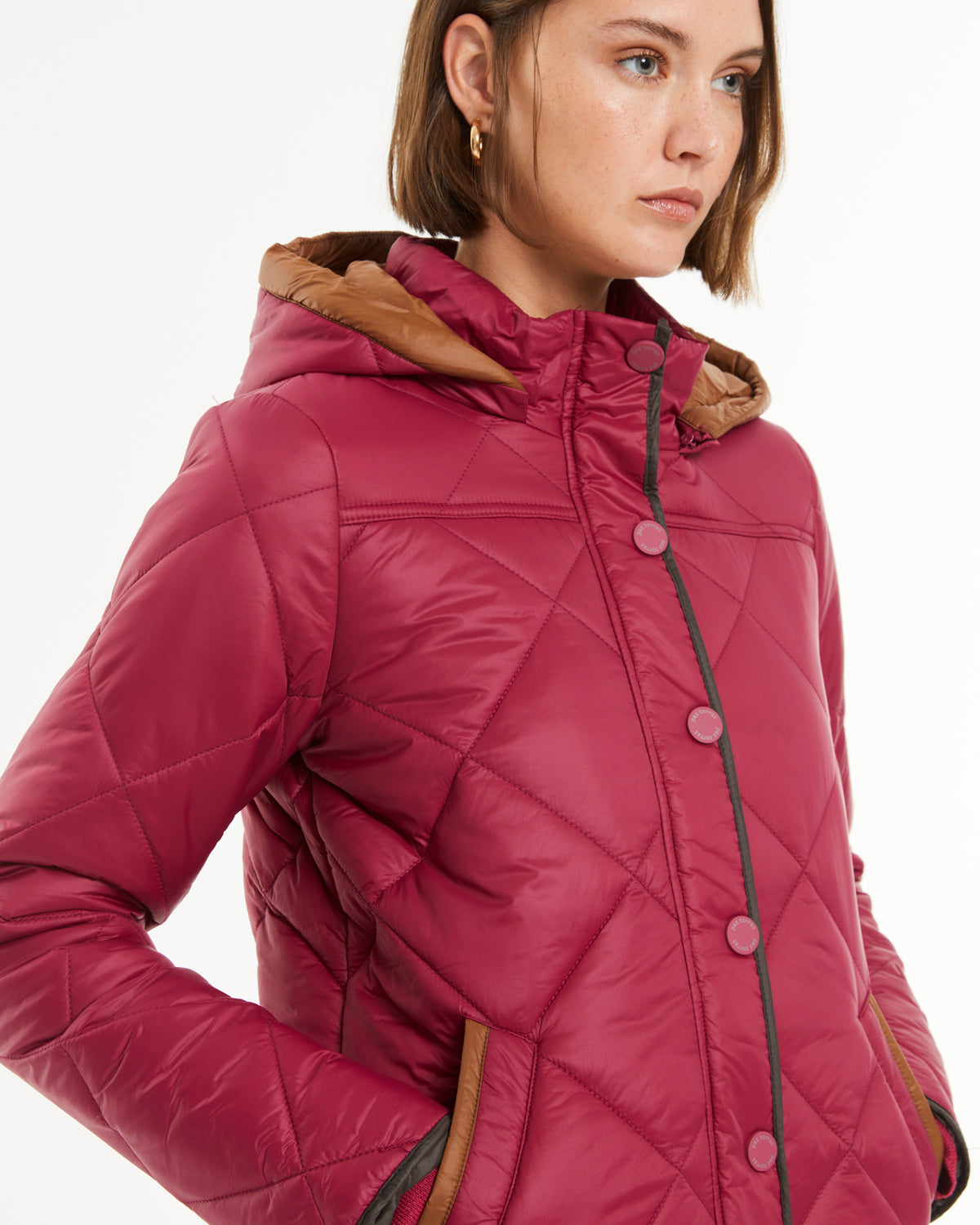 Plumífero acolchado de rombo con capucha desmontable y bolsillos. Envivada a contraste en puños, bajo y tapeta. Cierre frontal con cremallera y botones metálicos a presión. Regular fit.