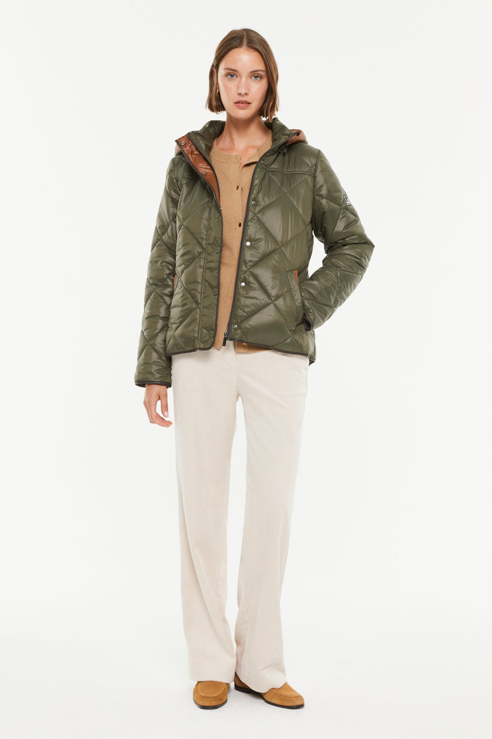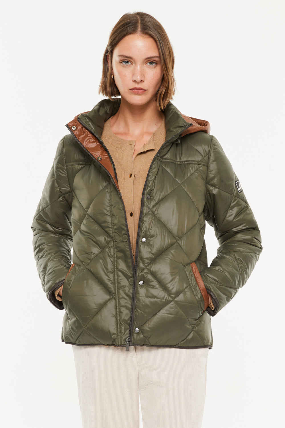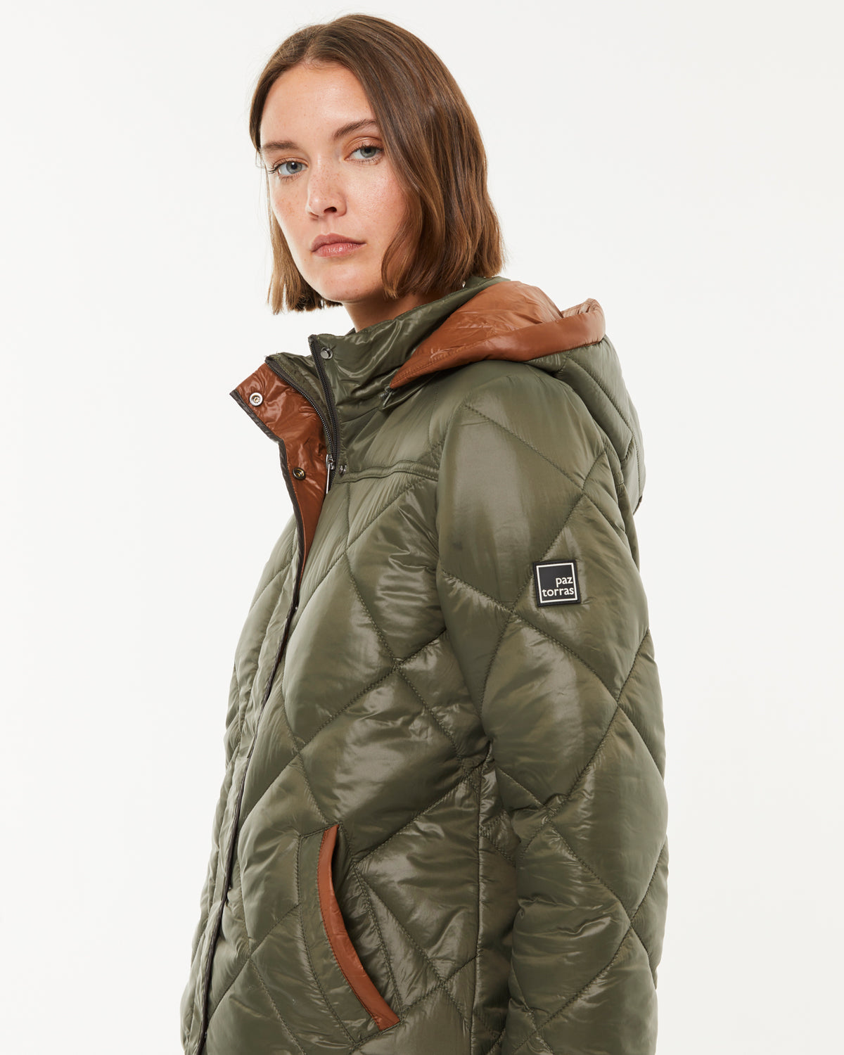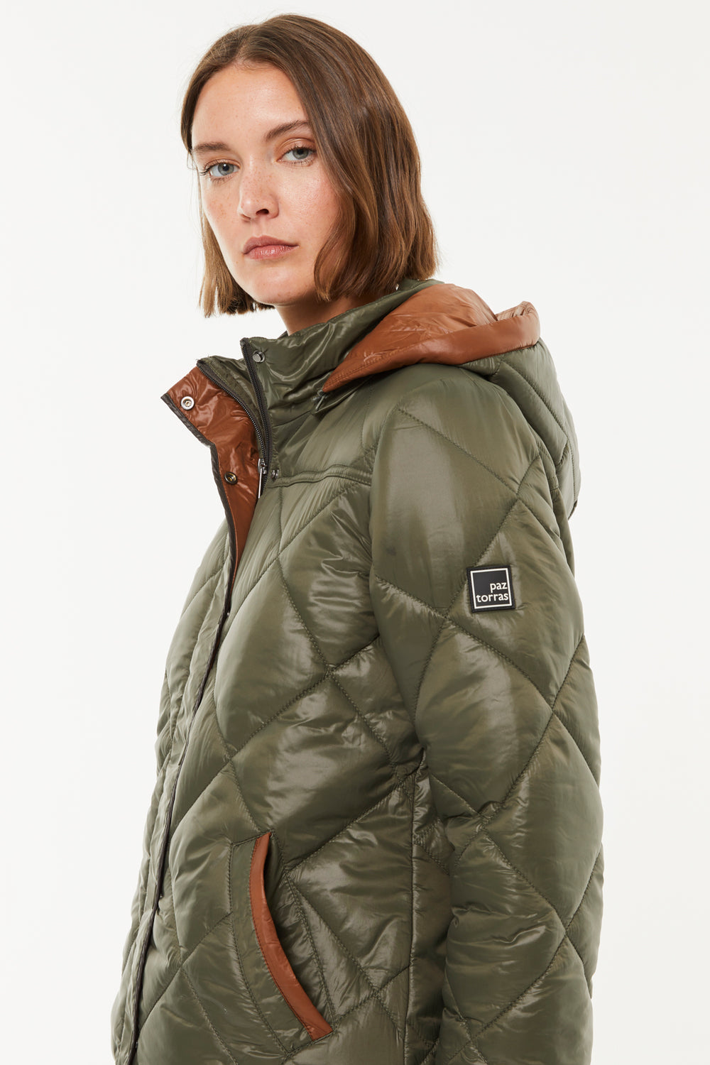 Plumífero acolchado de rombo con capucha desmontable y bolsillos. Envivada a contraste en puños, bajo y tapeta. Cierre frontal con cremallera y botones metálicos a presión. Regular fit.
