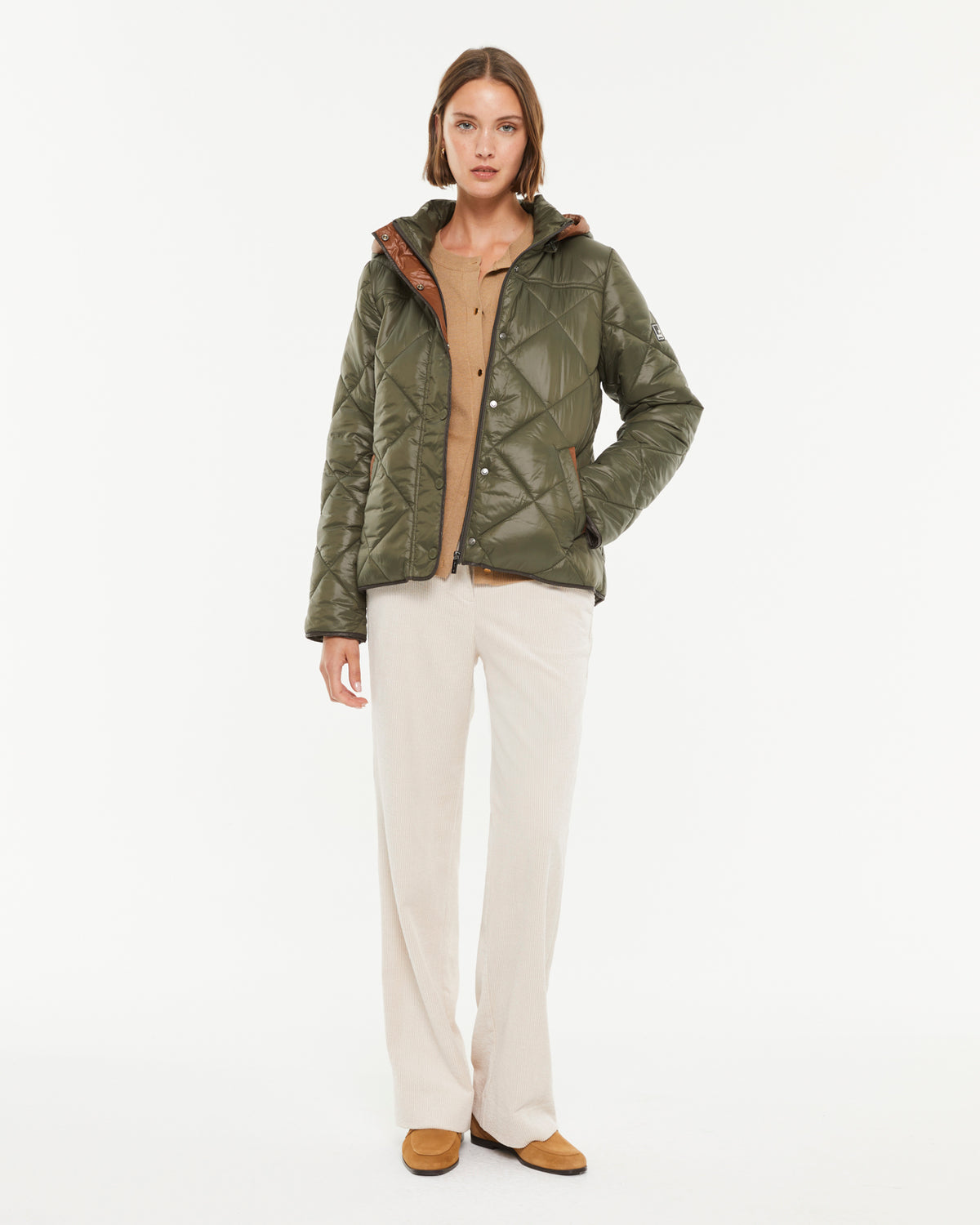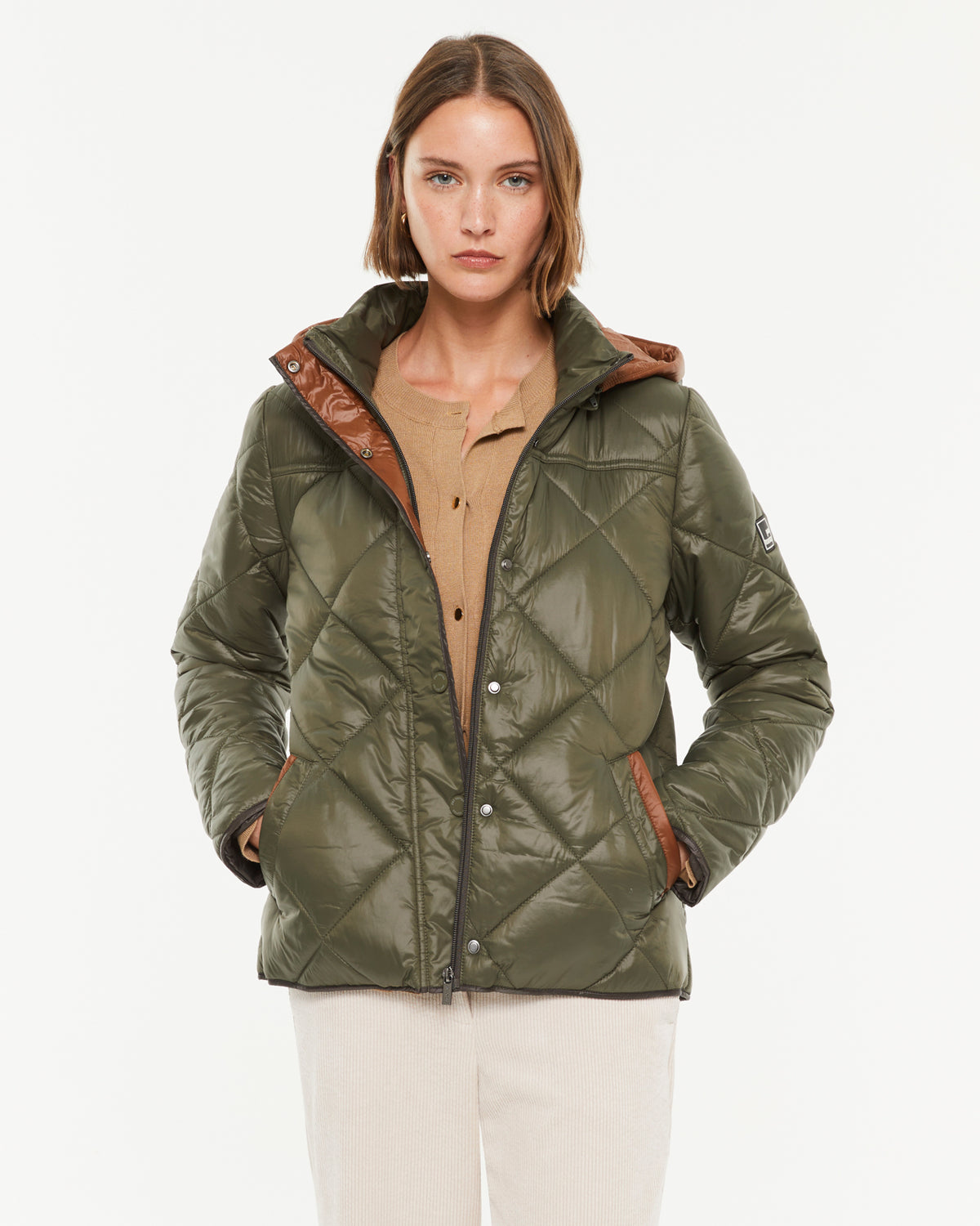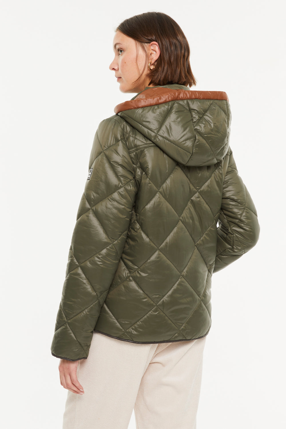 Plumífero acolchado de rombo con capucha desmontable y bolsillos. Envivada a contraste en puños, bajo y tapeta. Cierre frontal con cremallera y botones metálicos a presión. Regular fit.