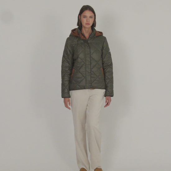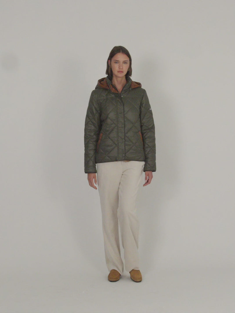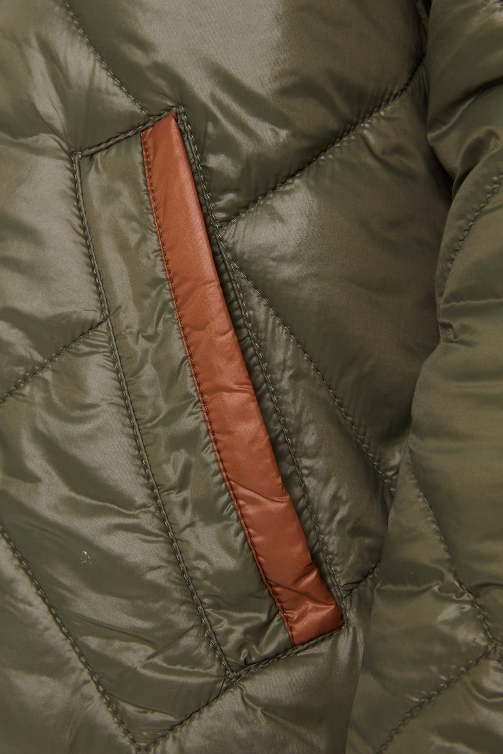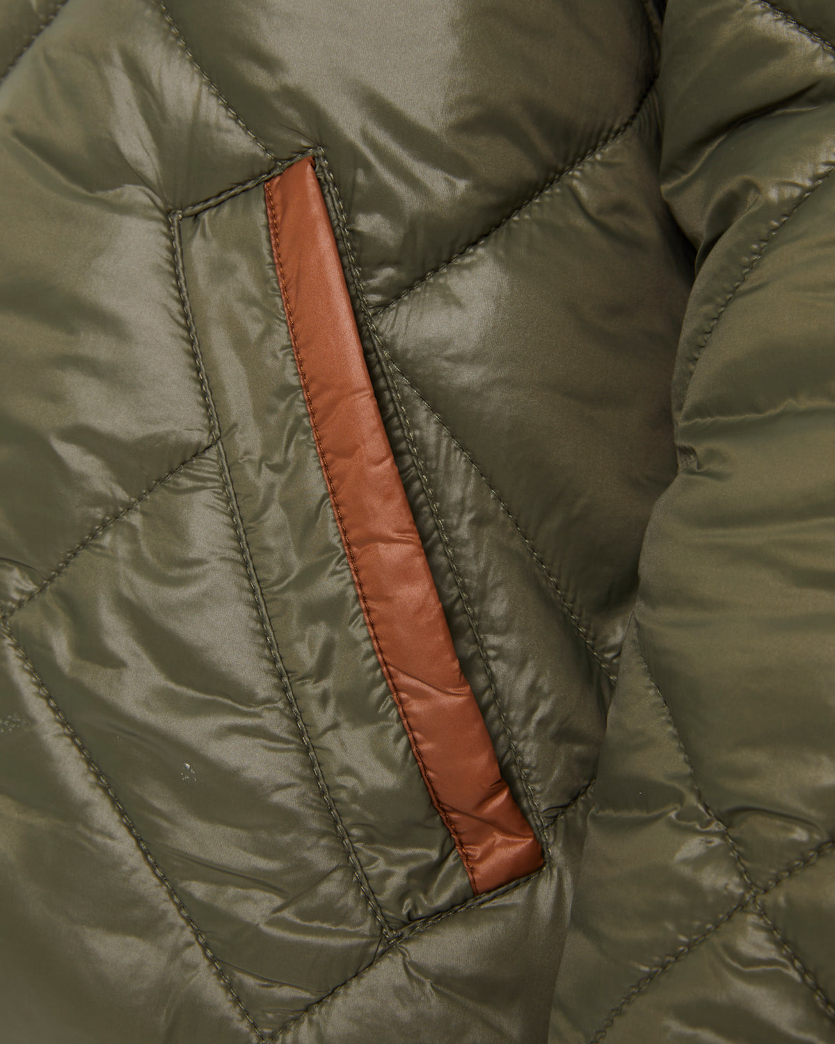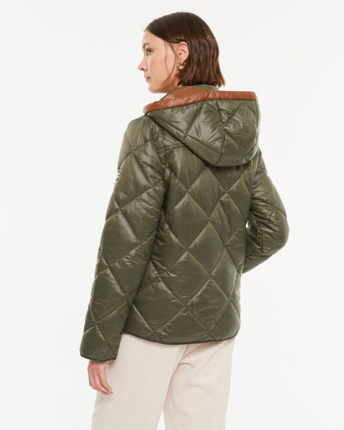 Plumífero acolchado de rombo con capucha desmontable y bolsillos. Envivada a contraste en puños, bajo y tapeta. Cierre frontal con cremallera y botones metálicos a presión. Regular fit.