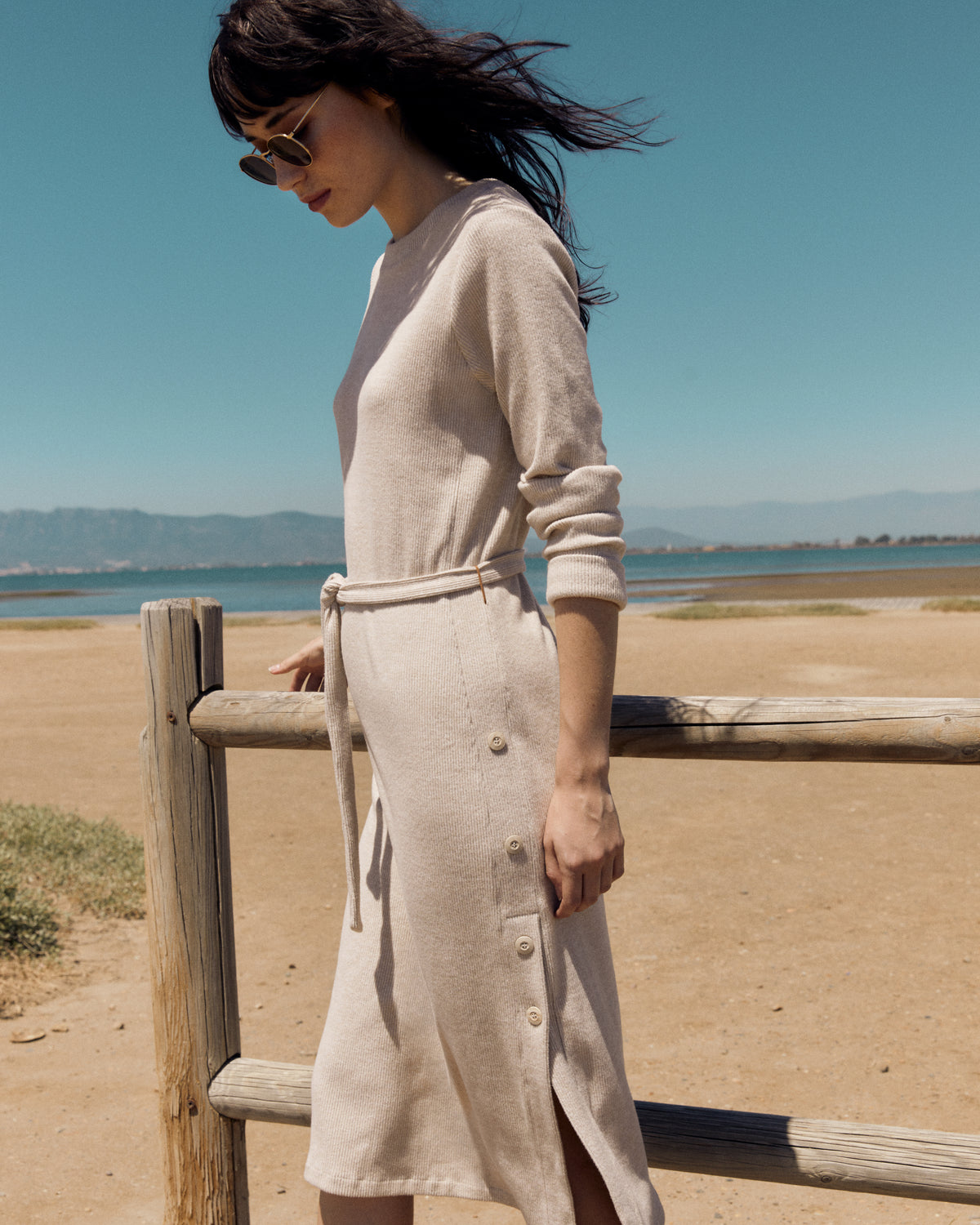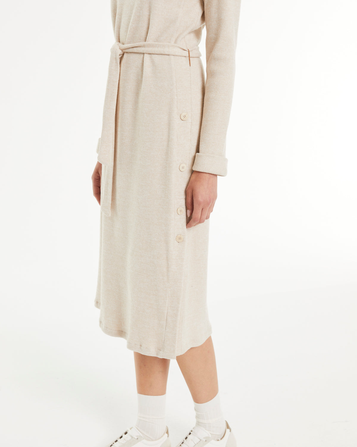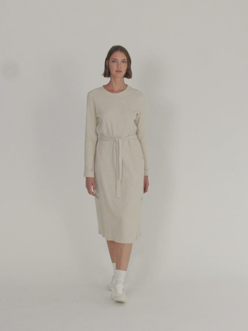 Vestido midi de punto liso, manga larga con puño y cuello redondo. Abertura lateral con botones. Lazada del mismo tejido. Se convierte en una de las prendas favoritas de la temporada por su comodidad y versatilidad. Regular fit.